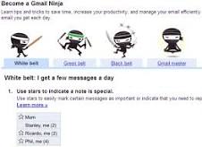 Gmail è probabilmente uno dei servizi più articolati che Google meete a disposizione.Fra funzioni aggiuntive,scorciatoie da tastiera,filtri avanzati e novità è possibile che,pur usandola ogni giorno con profitto,non ne sfruttiamo completamente le potenzialità.Fortunatamente gli sviluppatori hanno messo a disposizione una guida per imparare tutti i trucchi,divisa per livelli di difficoltà simili a quelli delle arti marziali...Per consultarla possiamo coolegarci qui.Possiamo consultare una serie di consigli.Purtroppo è disponibile solo in inglese,ma molti passaggi sono comunque piuttosto chiari.